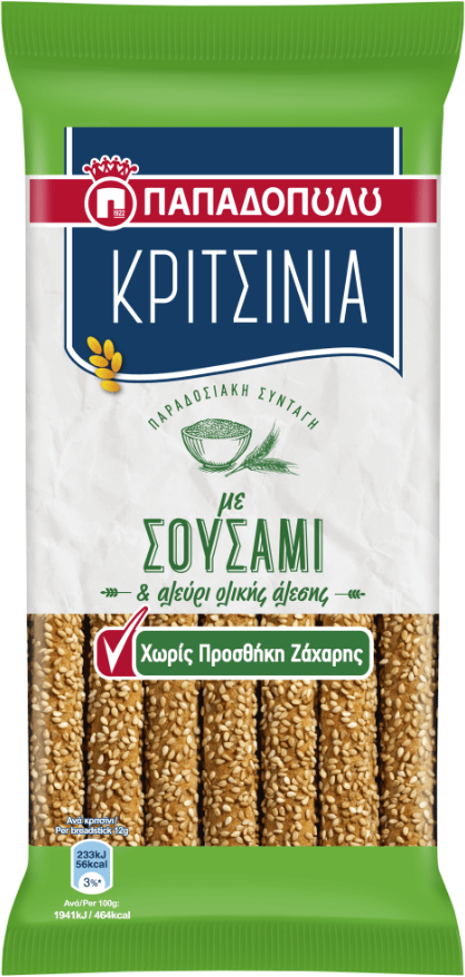 - 1 τμχ. ΠΑΠΑΔΟΠΟΥΛΟΥ - Kριτσίνια με σουσάμι χωρίς προθήκη ζάχαρης 170gr (λήξη 05/2026)